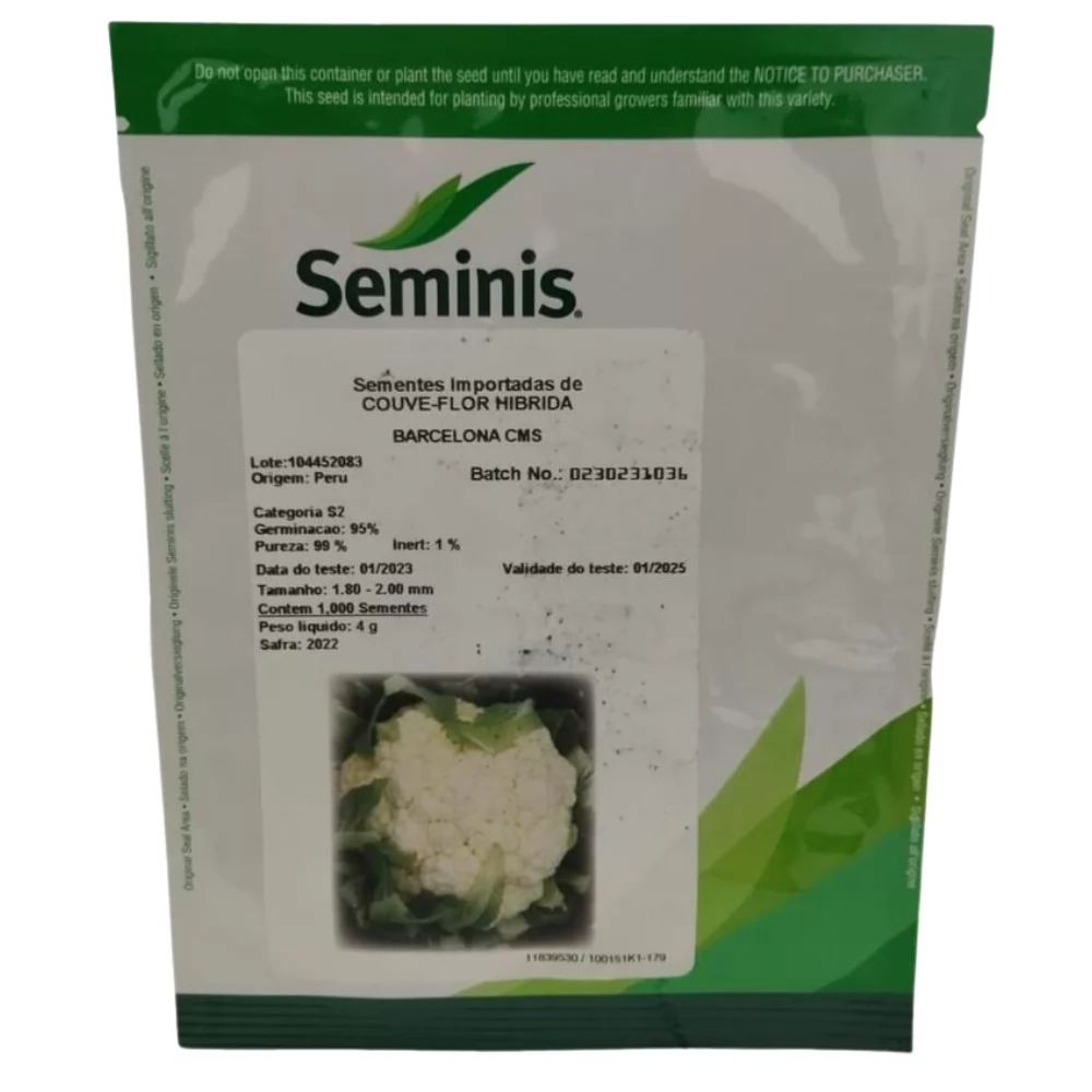 A Couve-Flor Híbrida Barcelona CMS é uma cultiva de produtividade elevada. Ideal para cultivos de meia-estação, a couve-flor Barcelona CMS desenvolve-se melhor em climas mais frios. É uma cultiva de grande vigor e uniformidade, cabeças com boa compactação e firmeza. Rica em cálcio, fósforo, ácido fólico e vitamina C.